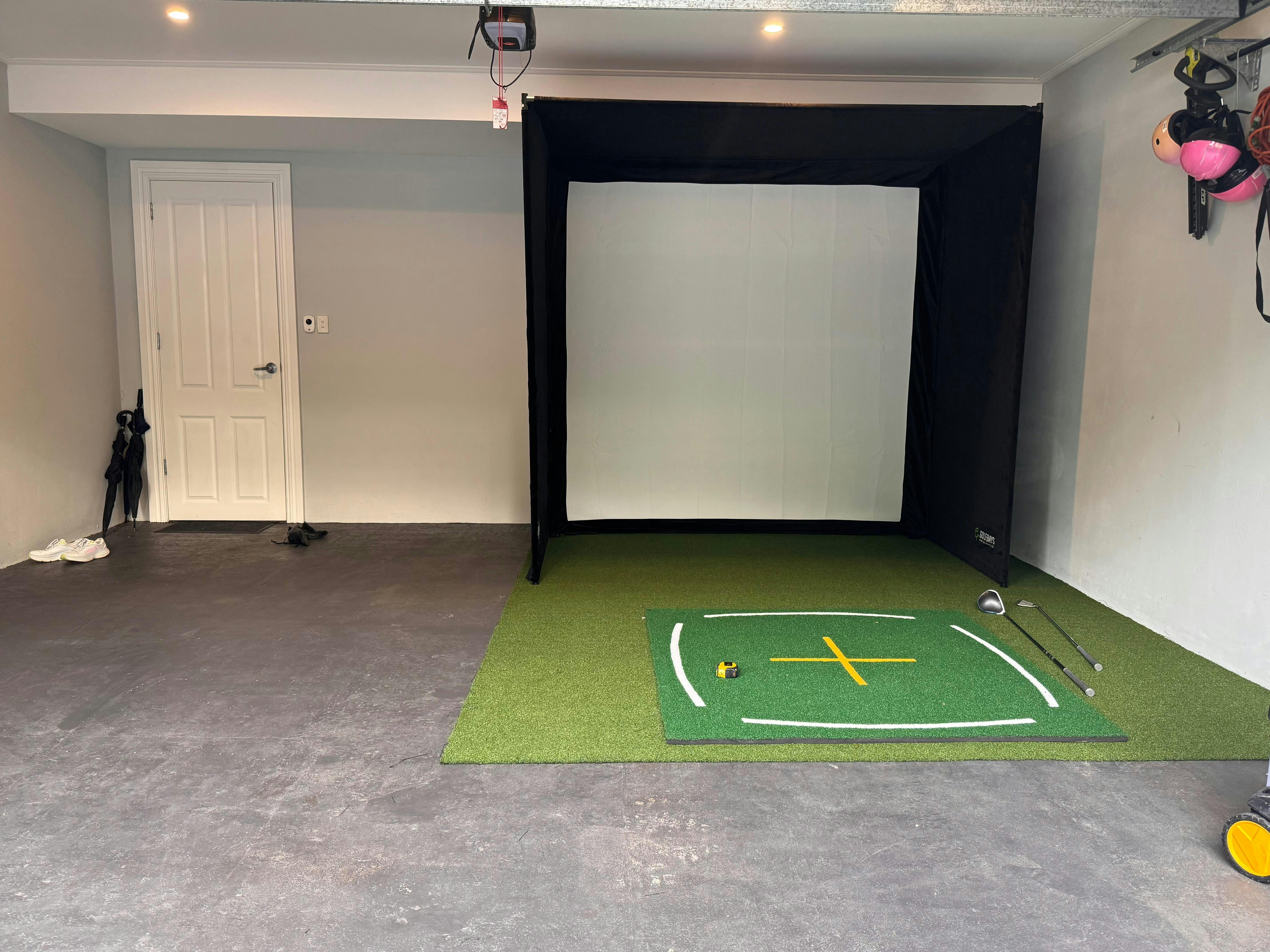 Recommended minimum room dimensions are 2.8 m high, 2.5 m wide, and 4.5 m deep. That’s enough for a full driver swing and projector placement. Smaller spaces are still perfect for iron play and putting. Add your favourite hitting mat, launch monitor, and projector, and you’ve got a complete, ready-to-go golf simulator setup at home.